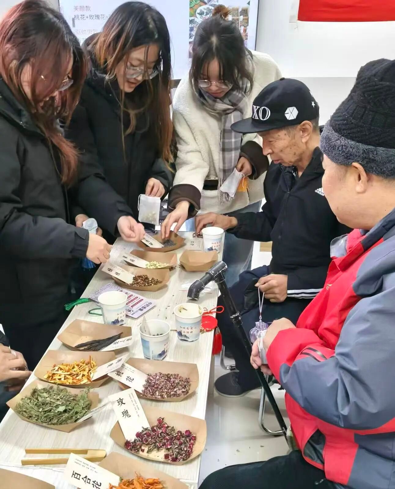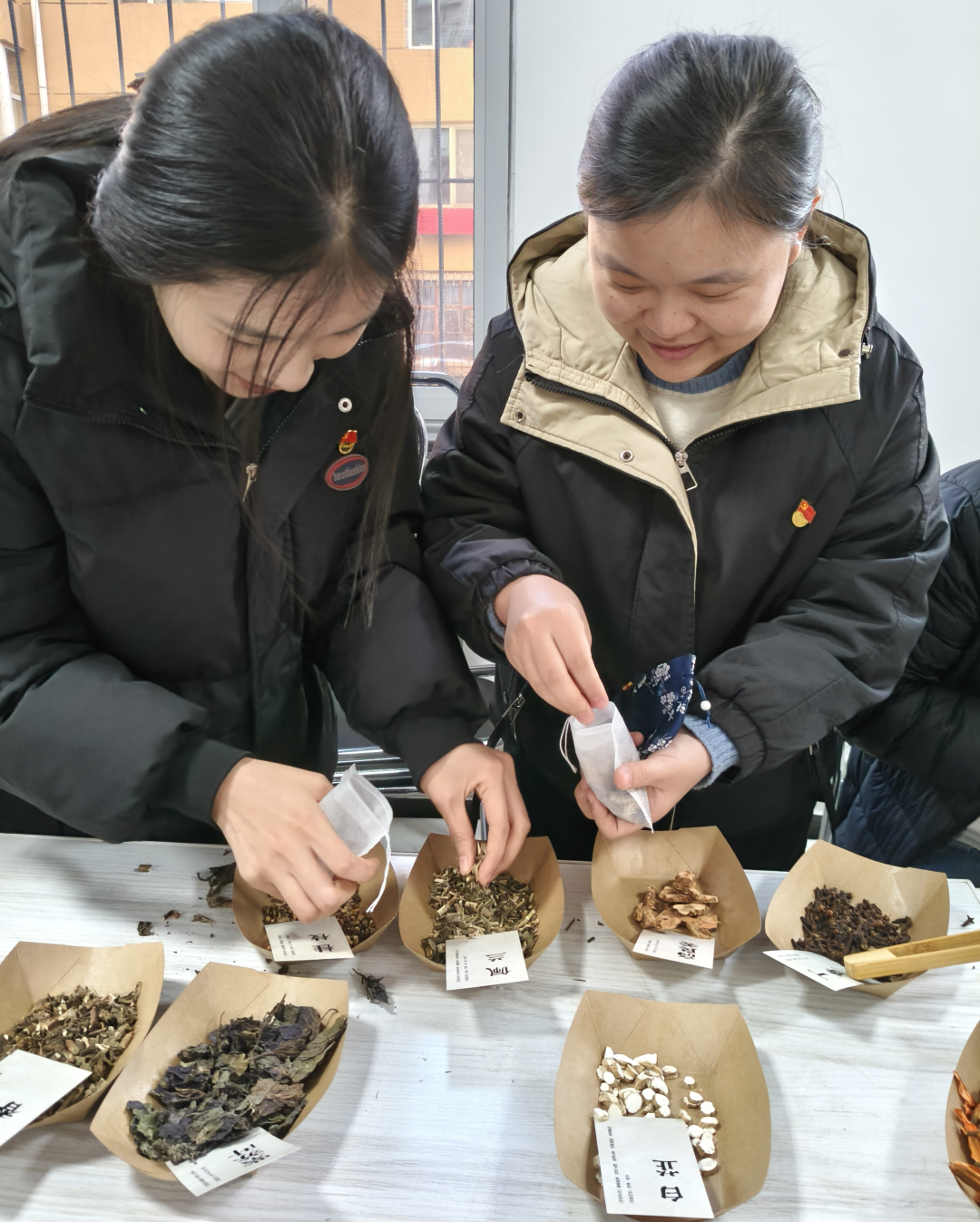 实操环节也是暖意融融,员工党员们分工帮扶。对于看不清药材标签的老人逐一介绍药材的功效;手把手教老人系香包绳结,还和老人聊起家常,关心他们的身体健康,叮嘱注意饮食调理;当有老人纠结配方时,党员同志主动上前了解其身体的情况,推荐丁香+高良姜的组合,边帮着混合药材边讲搭配原理。老人们一边跟着学做香包,一边分享过往的经历,党员们认真倾听,时不时呼应提问,现场满是温馨互动。